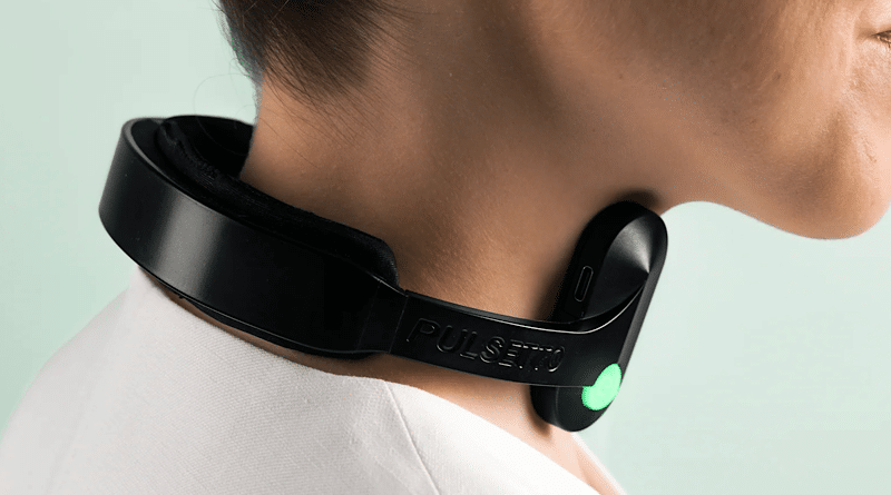 The Pulsetto device is a U-shaped silicone collar that wraps around the neck, positioning electrodes against both sides where the vagus nerve passes through the carotid sheath.